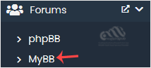 4. On the left side, locate the Forums category. Click on it and then on the MyBB link that appears.