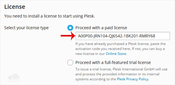 Step 4: Under the License section, should you have a license key, enter your Plesk license key or use a trial license by selecting a full-featured trial license.